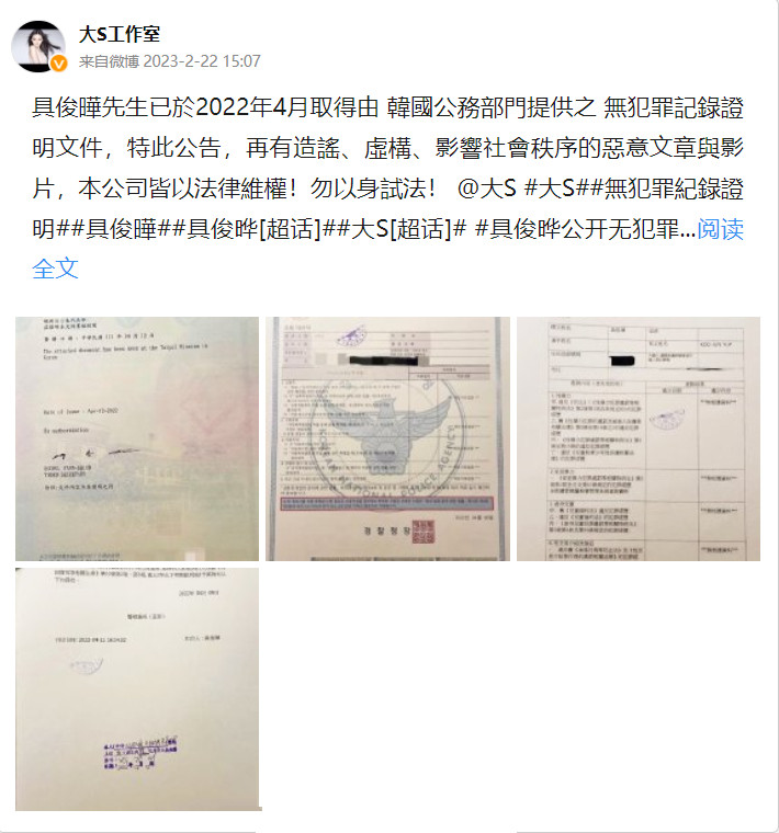 原标题:大S方回应将以法律维权 具俊晔公开无犯罪证明